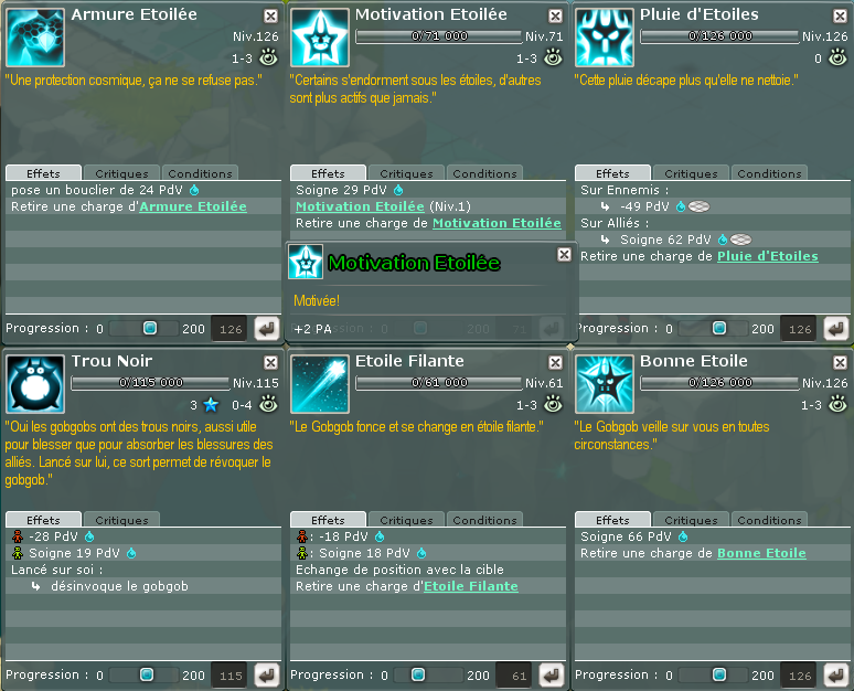 A noter que le Tofu coute pour l'instant plus cher étant donné qu'il correspond à l’ancien abonnement d'un an. Le Tourtobot devrait pouvoir le remplacer, mais je trouve qu'il ne donne pas assez de dégâts. ![]() C'est lui! Votre meilleur ami! Moitié osamodas, moitié dragon, il est aussi frêle que puissant! Ce tout tout petit bout de chose est votre force de frappe complémentaire. Emblématique de la branche Terre, il tire sa puissance de vos souhaits. Récapitulons ses caractéristiques : Vous ne pouvez l'invoquer que si vous n'avez pas d'autres créatures invoquées par vous en jeu. Ses caractéristiques suivantes sont égales aux vôtres (du début du combat, les bonus acquis durant l'affrontement ne comptent pas) : Vitalité, Résistance, Parade, Esquive, Coups Critiques et Bonus Soins. Les bonus dégâts aux dégâts des invocations n'ont pas d'effets sur lui. Il ne subit aucun dégâts mais les renvoit vers vous à travers vos éventuels boucliers, divisés par 2. Au niveau 9 du sort, il 6 Pa 6PmSorts du Gobgob Penchons nous sur ses sorts! Avant de les voir de plus près, comprenez-bien ceci : lancer X sort(s) Terre sur le Gobgob revient à lui donner pour 1 tour X charge(s) qui lui permet d'utiliser X fois son sort correspondant (où X<6). A la fin de son tour, la charge disparait. Je précise ici et maintenant que tous les soins du gobgob sont soumis à la limitation (effet "Res. Soin") des classes soignantes. Les valeurs données sont celles de mon niveau. ![]() C'est son premier sort : Trou Noir. Il a une belle particularité : il peut se lancer sans souhait. Son niveau est égal au vôtre. Au vu des caractéristiques de votre Gobgob, il peut être lancé deux fois par tour. Sur un ennemi, il frappe. En ciblant le Gobgob, il le renvoie d'où il est venu, c'est à dire d'on ne sait où (ou du Néant). Et surtout, sur un allié, il soigne! Avec Lien Bestial au level maximum, c'est un moyen de frapper et de soigner très efficace. Son absence de nécessité d'un souhait fait de lui un support de dégâts permanent génialissime. Sa Portée permet d'éviter de devoir trop vous rapprocher de votre symbiote, et donc d'être piégé par un sort de zone. Honnêtement, c'est, avec le suivant le sort du Gobgob que vous emploierez le plus. ![]() Voici son second sort : Armure Étoilée. C'est le sort Terre presque du même nom, Souhait Armuré, qui charge ce sort. Il peut donc se lancer jusqu'à 5 fois par tour. Mais vous savez ce qui est le mieux? C'est qu'on peut ainsi créer des armures de plus de 1000 PdV au total sur une personne! Oui! 1000 PdV! Je ne vois pas quoi dire de plus pour vous convaincrede son utilité. ![]() Et son troisième : Etoile Filante. Il est donné par Souhait Rapide, je précise, je précise C'est typiquement une Transposition, mais avec une portée différente. Veuillez noter (sortez vos cahiers les enfants!) que ce sort fait des dommages aux ennemis et soigne aux alliés. Puisque le sort élémentaire qui le charge ne se lance que deux fois par cible, le nombre de transpositions par tour est limité à deux. Cela est largement suffisant pour s'écarter et écarter l'ennemi au sein du même tour. Je ne recommande au passage pas ce sort pour ses dégâts, Trou Noir et Pluie d'Etoile font bien mieux. Ce qui ne signifie pas que vous devez exclure ce sort. Compris? (Paumé?) ![]() On continue la série avec son sort numéro quatre : Motivation Etoilée. Et comme aucune fois n'est pas coutume, le sort qui charge celui-ci ne porte toujours pas le même nom, c'est Souhait Motivant. D'un point de vue purement personnel, je trouve que cc'est ce souhait qui donne un intérêt au troisième sort Terre. C'est un de vos sorts les plus appréciés de alliés, et c'est évident : il donne 2 Pa à la cible en plus de la soigner. Note aux iops : ce n'est pas un sort de frappe : ne l'utilisez jamais sur un ennemi par inadvertance, ça fait très mal. ![]() Ceci est son cinquième sort (vous avez vu, je sais compter tous mes doigts!) : Bonne Étoile. C'est le Souhait de Protection qui offre à votre symbiote la charge correspondante. Son soin le meilleur de tous vos sorts, il fait du 400 sans CC. C'est lui qui nous permet véritablement de soigner! Un vrai bon must have! En plus, on peut le coupler au second pour mêler soin et armure dans un superbe duo! ![]() On finit en beauté avec Pluie d’Étoile, octroyée par le Souhait de Faiblesse. C'est LE sort qui sera utile en groupe, dans un combat avec beaucoup d'adversaires. En effet, il a la capacité de taper dans une zone du type du souhait qui le charge (une zone à la façon de la Colère de Iop), centrée sur le Gobgob. Mais ce n'est pas tout : seuls les ennemis de la zone sont frappés tandis que les alliés sont soignés! Le soin est légèrement inférieur à celui de Bonne Étoile. Ce sort ayant un effet de zone, il est par conséquent notre sort de soin multicible le plus important. Le seul bémol que l'on peut trouver, ce que lancer ce sort implique d'exposer le Gobgob au danger. Petite conclusion sur le Gobgob Vous l'avez vu, grâce à lui, nous sommes capables de soigner, de donner des armures, de transposer, de donner des Pa, de donner des Résistances et même d'en retirer. En cherchant bien, vous avez des possibilités immenses de jeu, d'attaque et de soutien avec votre symbiote. Profitez-en, ce n'est pas donné à toutes les classes! ![]() ![]() Amusons-nous! Nous, osamodas, avons une foule de sort si l'on compte ceux du Gobgob, qui a ici une partie dédiée. C'est d'ailleurs ce qui nous donne une grande malléabilité. Imaginez : nous pouvons invoquer, frapper, faire un bouclier, transposer, soigner et tant d'autres choses. Sans oublier les capacités propres aux invocations que nous pouvons éventuellement placer! Les sorts Terre Sachez que tous nos sortilèges peuvent charger le Gobgob (voir plus haut). Le nom de la charge est le même que celui du sort. J'ai choisi de ne pas optimiser les niveaux de
